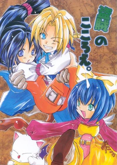 This doujinshi is mostly few gags ranging from 2 to 4 pages long. Stiltzkin sells Zidane a "mystery package" for 9,999,999 gil (have you ever made that much money in this game?). Zidane expects it to be something really powerful or useful, but instead it's... cheesecake pictures of a moogle. In another gag Eiko sticks googly eyes and a propeller into Salamander's hair (while he's not looking, of course!) so that from the back it looks like he has a Muppet on his head. These gags are pretty easy to get without any knowledge of Japanese. In another gag which does require some knowledge of Japanese, we see Eiko's version of herself and Vivi as adults. Same clothes, different bodies in 'em, and Vivi appears to be a 20-foot-tall tango dancer.