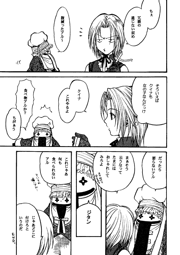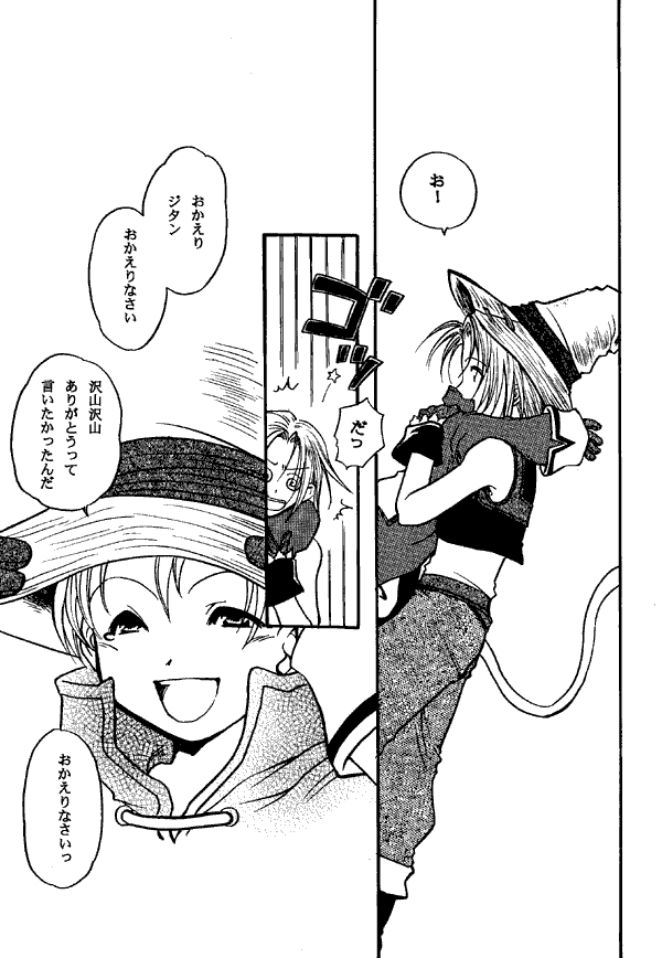 This doujinshi has two main stories. The first is a three page gag in which Zidane has bought a ribbon at the Treno auction. He tries to give it to Garnet, but she has cut her hair and has no way to use a hair ribbon. Eiko already has a ribbon, and Freya isn't interested. So Zidane tries it in his own hair (if you've played the game you know that a ribbon gives quite a stat boost to people of either sex!) and though Vivi thinks it's cute, Salamander finds it objectionable. Finally Zidane gives it to Quina... who has no hair, so he ties it onto hir tongue like a bow tie.