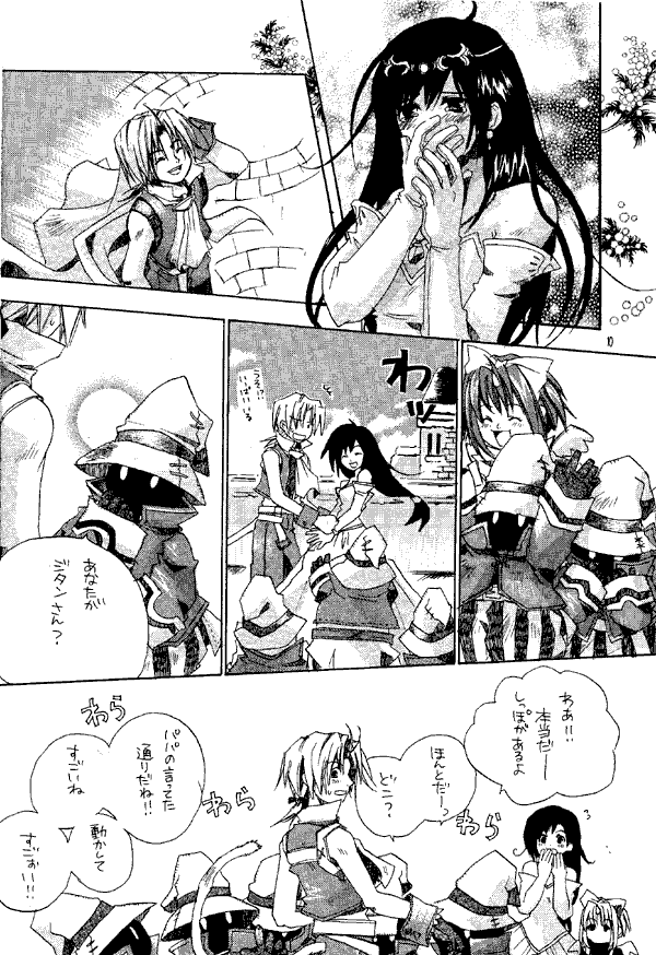 The serious story in this doujinshi starts with a conversation between Zidane and Kuja about Vivi. Then Zidane makes his grand return onstage, and after he and Garnet embrace they (and Quina, Eiko, Steiner, and Freya) meet Vivi's children. It's a happy (and chaotic) reunion, even thought "Papa" Vivi doesn't appear to be among them.