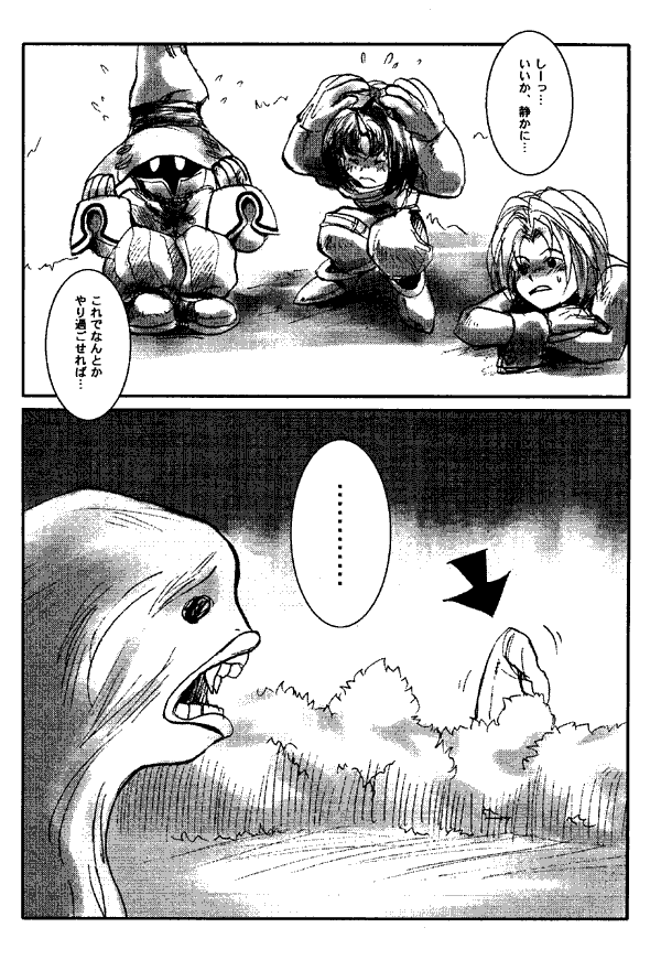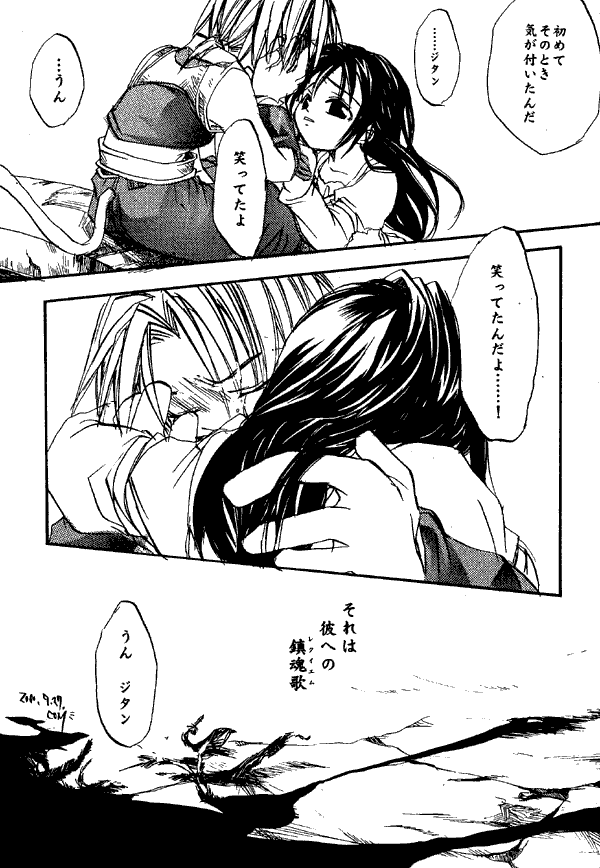 There are a few gags in this doujinshi, including one in which Zidane sticks Vivi's face with a pin (!) and Vivi deflates. In another, Zidane, Vivi, and Eiko flee from a battle with a yeti. However, Vivi's hat, visible above the tall grass, gives them away when they try to hide. The serious story seems to be a conversation between Zidane and Dagger in which Zidane describes Kuja's death in the Iifa tree.